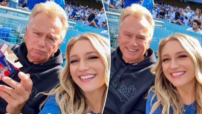 Pat Sajak is seen snacking on what appears to be a box of Cracker Jacks, as he is all smiles in the stadium with his daughter. (Maggie Sajak/Instagram)